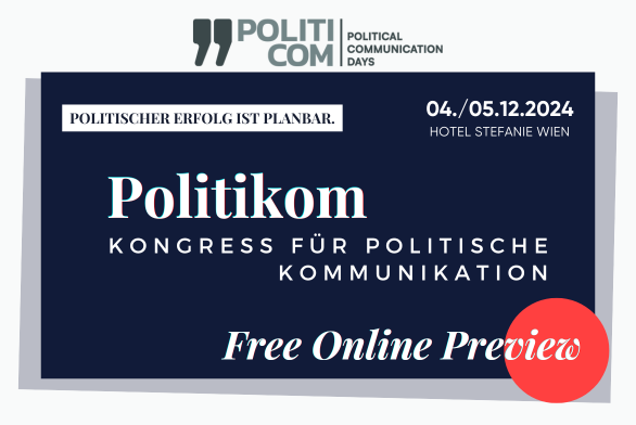 So lautet das Motto unseres Kongresses für politische Kommunikation, POLITICOM, der von 04.-05.12.2024 zum zweiten Mal in Wien über die Bühne geht. Seien Sie dabei, wenn wir über die zunehmende Komplexität politischer Kommunikation sprechen und die neuen Spielregeln unter einer wachsenden Dominanz von Social Media und Co. analysieren. Wir blicken zudem auf die konkreten Lehren aus der EU-Wahl und der bevorstehenden US-Wahl und gehen einmal mehr der Frage nach was die politische Mitte in ihrer Kommunikation tun kann, um weiteren Abwanderungen der Wählerschaft entgegenzuwirken.