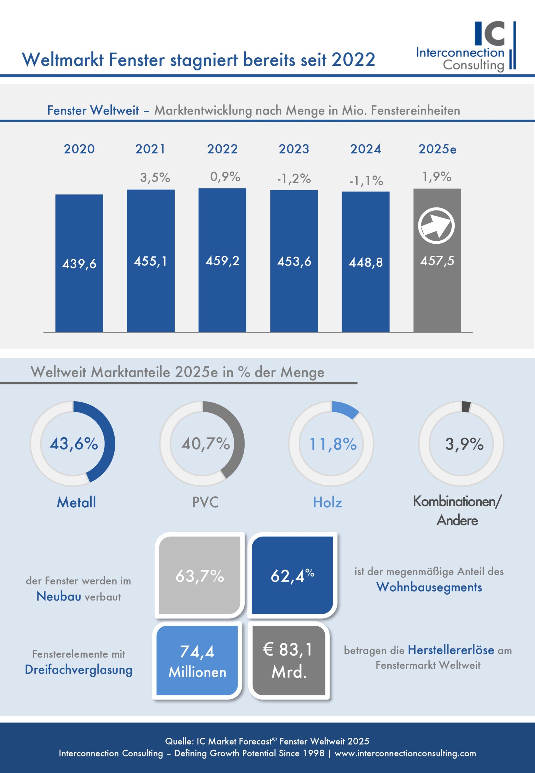 Der globale Fenstermarkt hat im vergangenen Jahr ein Volumen von 448,8 Millionen Fenstereinheiten erreicht, was einem Rückgang von 1,1% entspricht. Gleichzeitig gingen die Herstellererlöse um 1,7% auf 81,1 Milliarden Euro zurück. Die Entwicklung für 2025 ist zwar positiv, mit einer prognostizierten leichten Steigerung des Volumens um 1,9% auf 457,5 Millionen Fenstereinheiten, damit liegt der Markt jedoch noch immer leicht unter dem Niveau von 2022, wie eine neue Studie von Interconnection Consulting zeigt.