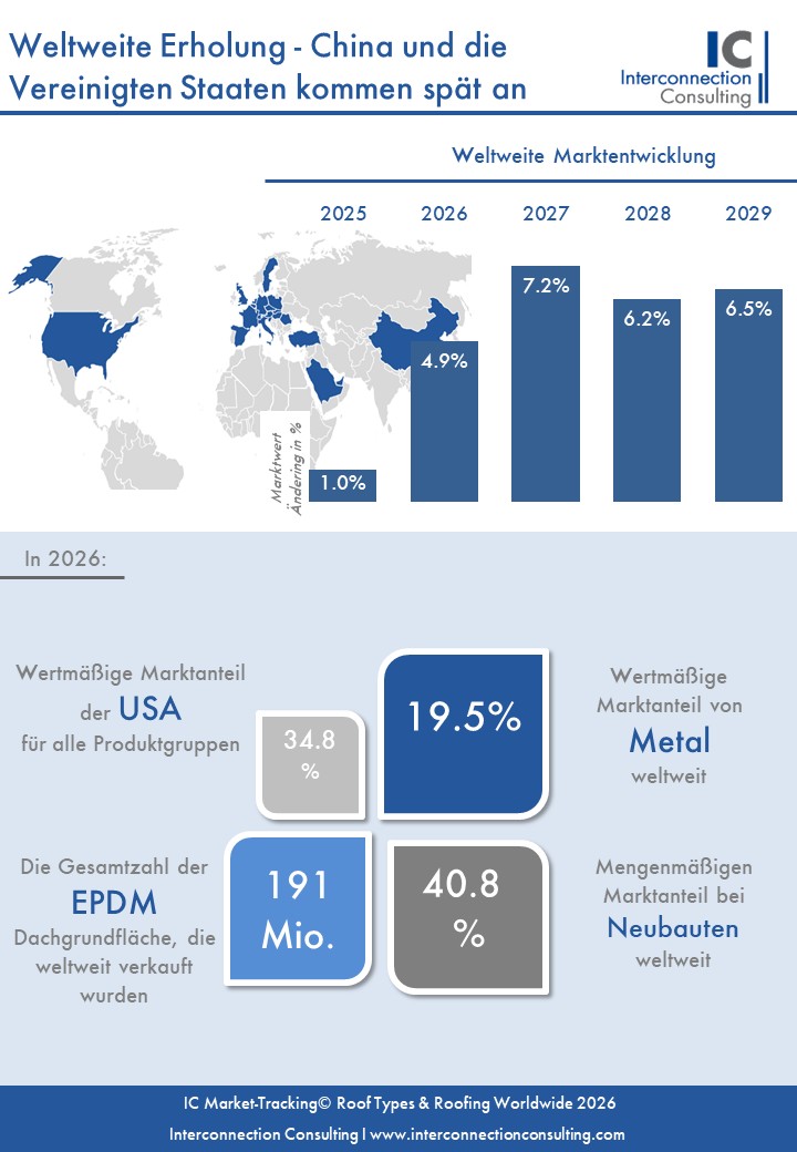 Der globale Markt für Dachlösungen bleibt auf Wachstumskurs: Für das Jahr 2026 wird ein Marktvolumen von 27,2 Milliarden Euro erwartet, was einem Anstieg von 4,9 % gegenüber dem Vorjahr entspricht. Mengenmäßig wird ein Wachstum von 3,2 % prognostiziert, wobei sich insbesondere die USA im internationalen Vergleich schwächer entwickeln.