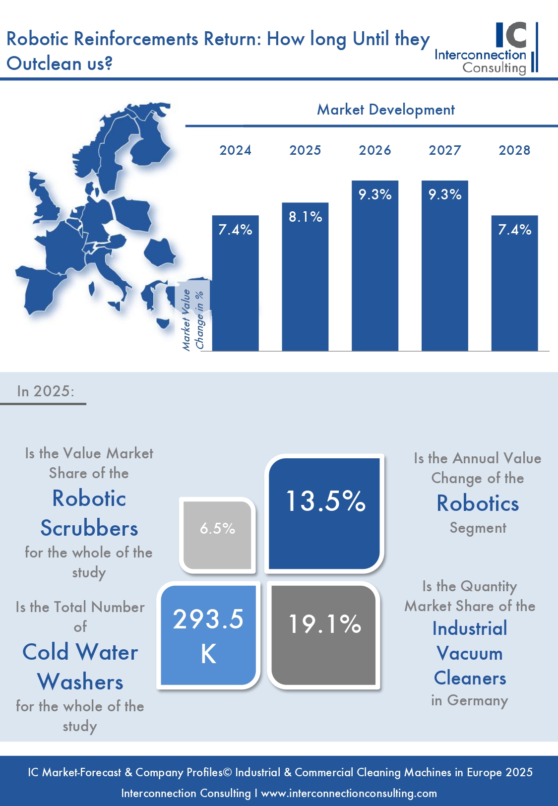 These results come from the study IC Market Forecast® Industrial & Commercial Cleaning Machines in Europe 2025, by Interconnection Consulting, covering major markets such as Germany, France, the United Kingdom, Italy, Spain, Switzerland, Austria, Poland, Turkey, Benelux, Greece, Romania, and the Nordics.