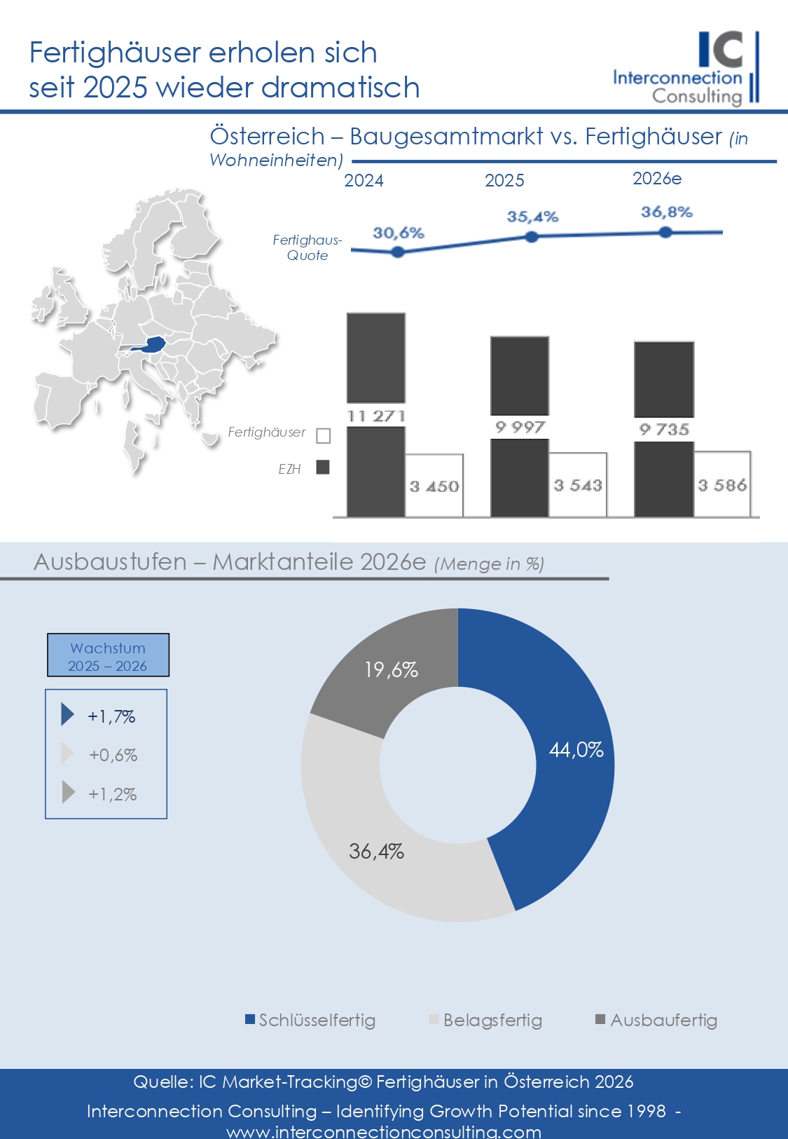 While Austria’s overall residential construction market continues to face significant pressure, the prefabricated housing sector is proving remarkably resilient. Despite an ongoing downturn in the construction industry expected to last until the end of 2026, the prefabricated home segment already achieved volume growth of +2.7 percent in 2025. A further increase of +1.2 percent is forecast for 2026. In value terms, the market is projected to grow by +4.8 percent, according to a study by Interconnection Consulting.