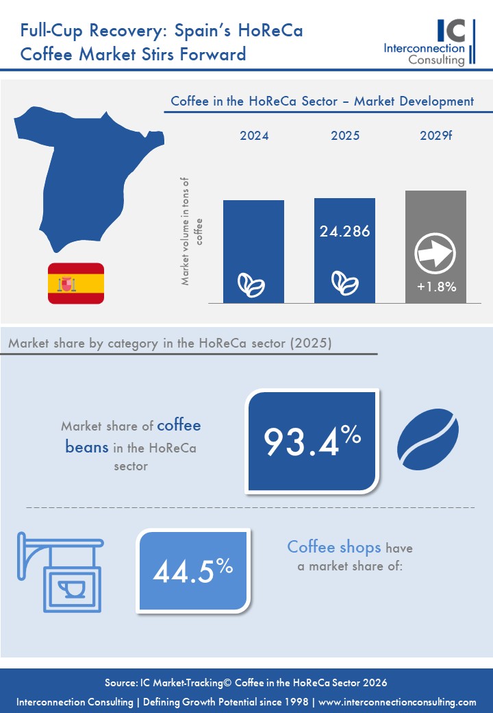 The coffee industry in the HoReCa channel in Spain continues its sustained growth trend, registering a +2.0% increase in sales volume in 2025, reaching 24,286 tons, driven mainly by the continued recovery and expansion of tourism, as well as the strengthening of out-of-home consumption, according to IC Market Tracking – Coffee in the HoReCa sector in Spain by Interconnection Consulting.