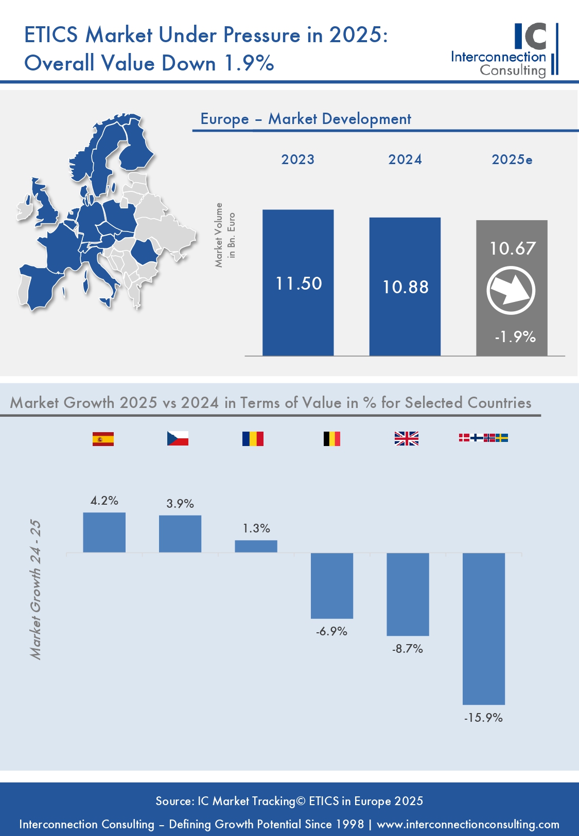 After several years of volatility, Europe’s ETICS (External Thermal Insulation Composite Systems, also known as EIFS) market reached its low point in 2025, driven by a sharp slowdown in construction and renovation, high financing costs, and cautious investment decisions. Installed volumes fell to 238.5 million m² (–2.9% year-on-year), while market value declined by –1.9% to €10.7 billion.