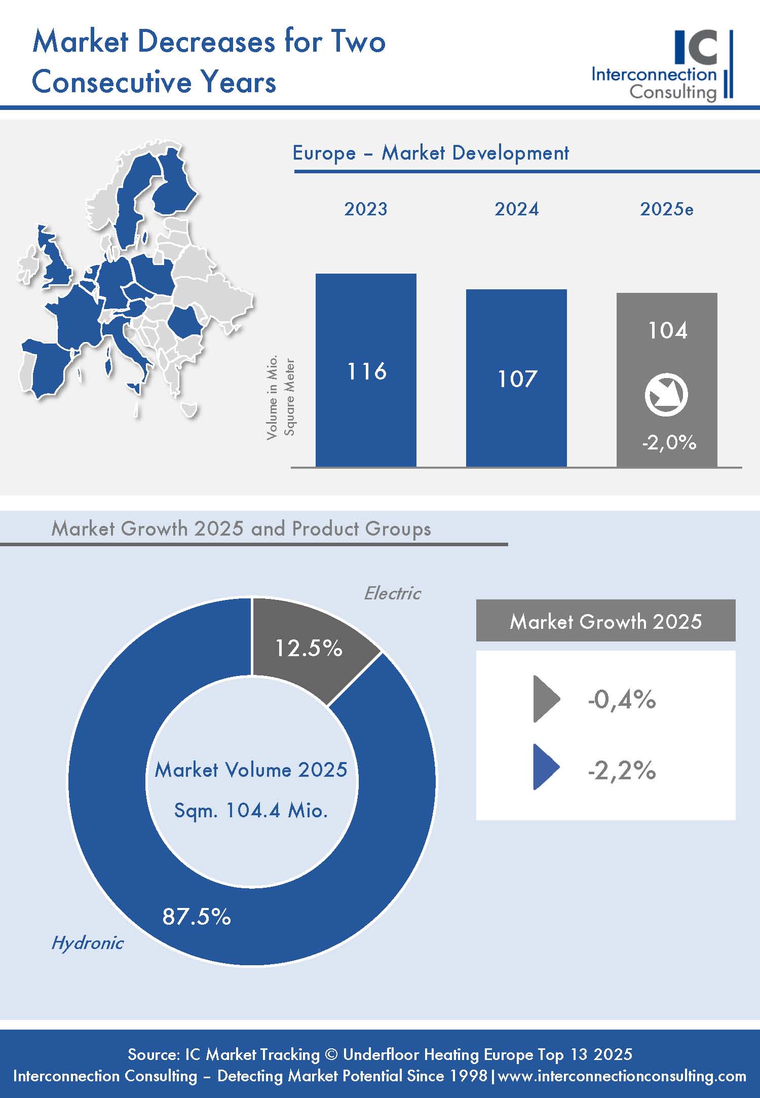 Vienna, October 2025 Despite a cooling housing market, Europes underfloor heating (UFH) industry continues to heat up. In 2024, more than 106 million square meters of UFH systems were sold across Europes top 13 markets, which represents a fall of 8.2% compared to the previous year. While short-term sales were impacted by the construction downturn, long-term growth remains intact. Policies such as the European Green Deal and the shift toward low-emission, energy-efficient buildings continue to support the market. The residential segment is expected to slightly lose share to non-residential applications, as the latest study by InterConnection Consulting shows.