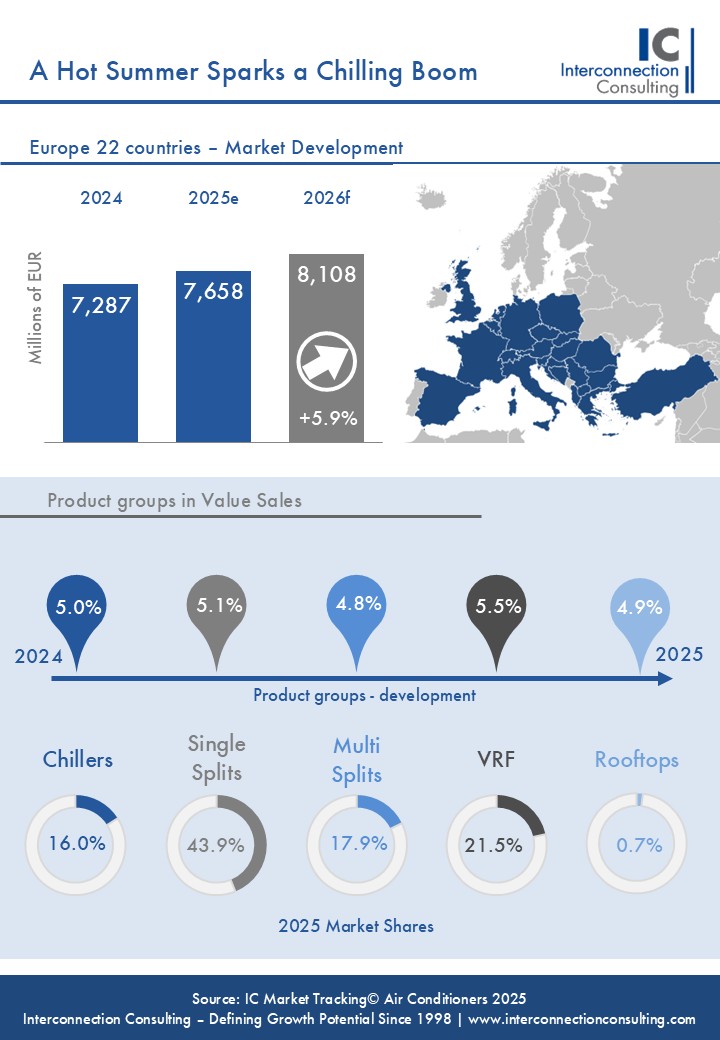 The European air conditioners market is enjoying a period of solid growth, driven by record heat, rising comfort needs, and greater awareness of energy efficiency. According to IC Market Tracking – Air Conditioners in Europe by Interconnection Consulting, sales increased by 4.3% in value in 2024. With another warm year ahead and growing replacement demand, the market is expected to reach 7.7 EUR billion, continuing its positive path in 2025—up 5.1% in value—as air conditioning becomes an increasingly essential part of European homes and buildings. “The year 2024, the hottest ever recorded in Europe, triggered an unprecedented demand for air conditioning systems, especially in the residential sector,” explains Róbert Lukáč, author of the study. “Many consumers prioritized purchasing an air conditioner over other expenditures, including vacations, leading to temporary product shortages in several countries.” After a year of contrasting dynamics across Europe, both Western and Central & Eastern markets are set to continue expanding in 2025. In Western Europe, following moderate growth in 2024 (3.0% in value), the market is expected to accelerate by 4.5% in value. Meanwhile, Central and Eastern Europe—where 2024 marked a remarkable rebound (9.4% in value)—will keep the momentum with projected increases of 6.2% in value. Climate change, the need to cut energy costs, and the replacement of older systems continue to sustain demand, with compound annual growth rates (CAGR) forecast at 4.9% in Western Europe and 6.0% in Central and Eastern Europe through 2028. From a product perspective, the market’s vitality is reflected across segments. A compact A/C unit mainly used in residential systems such as single-split and multi-split units grew by 3.8% and 3.4%, respectively, while more advanced commercial technologies—VRF systems (+3.6%), Rooftops (+3.1%), and Chillers (+3.4%)—also performed strongly. The appeal of smart and connected solutions, offering users greater comfort and control, is reinforcing this positive trend. Even with rising competition from alternative cooling and heating systems—like cooling ceilings or floor-based heat pumps—the air conditioning market remains resilient. In fact, in some countries, reduced heat pump subsidies have made air conditioners an even more attractive option, as they efficiently provide both cooling and heating. Looking ahead, Northern Europe—historically less reliant on air conditioning—is expected to see the fastest growth, while Southern Europe continues expanding through replacement of older units. Urbanization, modernization of buildings, and the growing desire for better indoor comfort are expected to keep the market’s outlook bright. The industry remains highly consolidated, with Carrier, Daikin, Fujitsu General, GREE, Hitachi, LG Electronics, Midea, Mitsubishi Electric, Panasonic, Samsung, and Toshiba together controlling 70.7% of the European market. In the single & multi splits used largely for residential segment, Daikin, Fujitsu, LG Electronics, Mitsubishi, Panasonic, and Toshiba lead the way, while Carrier, Daikin, Hitachi, Mitsubishi, Toshiba, and Trane dominate the non-residential market.
